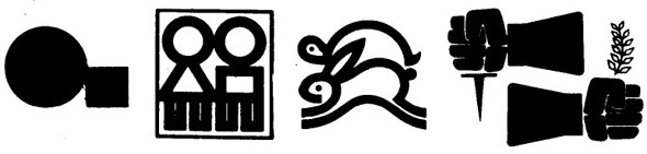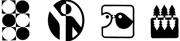 下圖4六棵樹中,三棵為黑色,正置;三棵白色,倒置,三棵倒置的白樹象是月光下或水池中的倒影。該標(biāo)志同時(shí)采用了黑白、位置雙元對(duì)比技法。